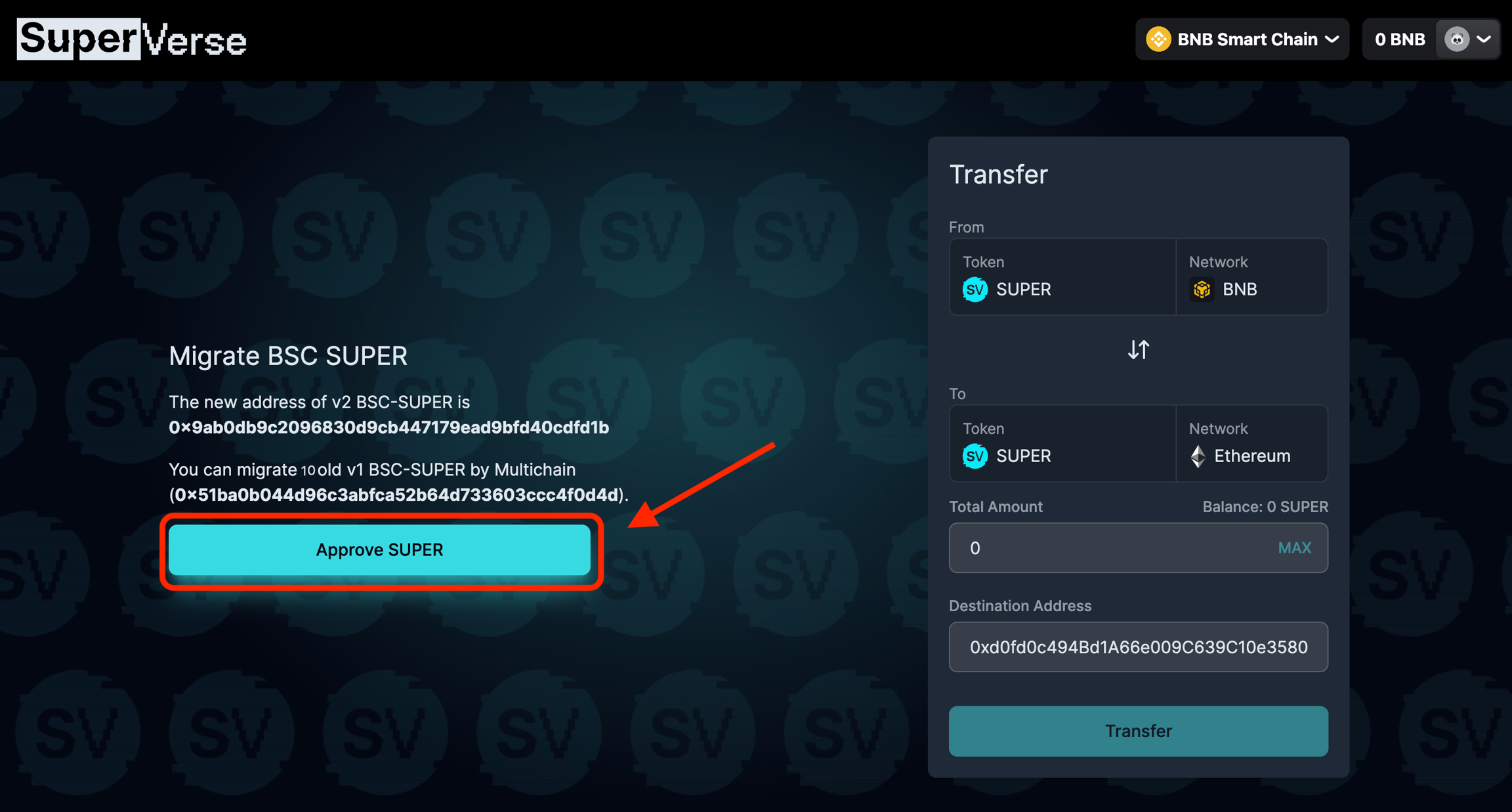 승인이 완료되면, “Migrate v1 SUPER” 버튼을 누르세요. 실행되면, 기존 SUPER-BSC v1은 스왑(Swap)되고 소각(Burn)되어 SUPER-BSC V2로 교환됩니다.