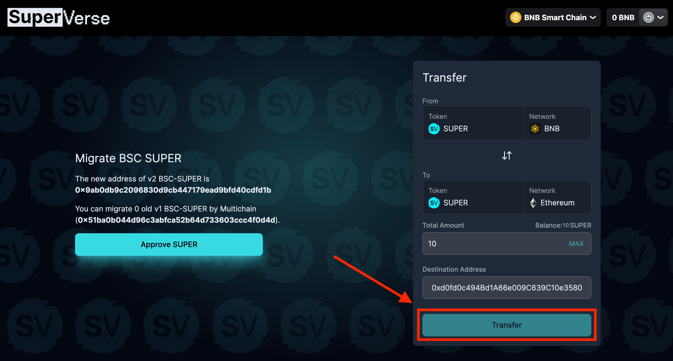SUPER-BSC V2에서 SUPER-ERC20으로 브리징(Bridging)